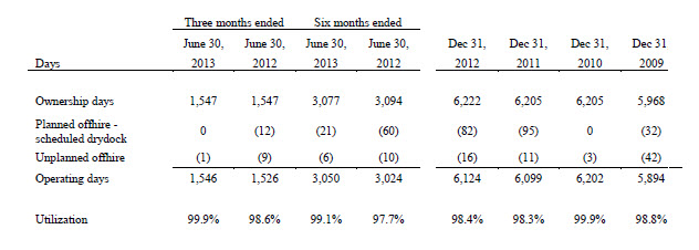 The table below shows fleet utilization for the three and six months ended June 30, 2013 and 2012 and for the years ended December 31, 2012, 2010 and 2009.