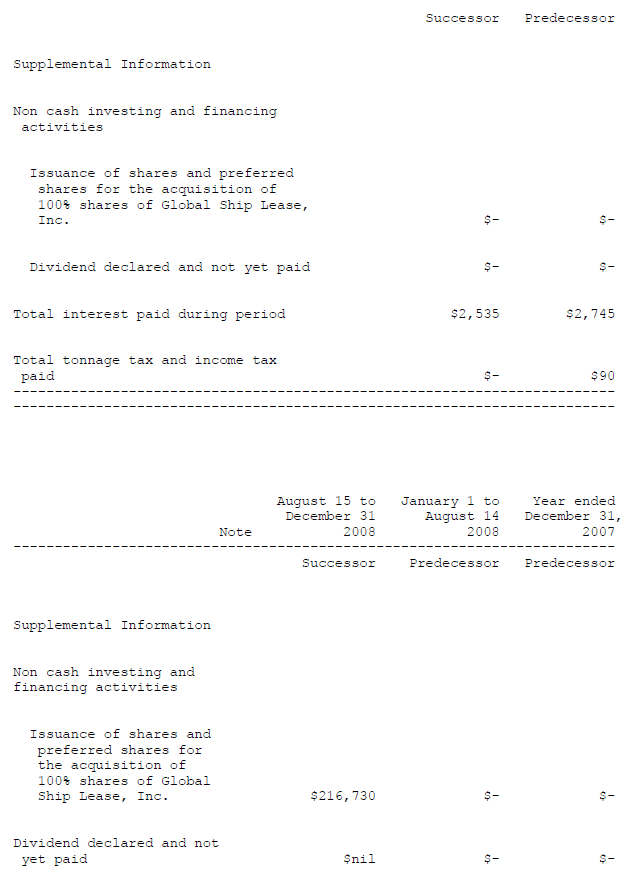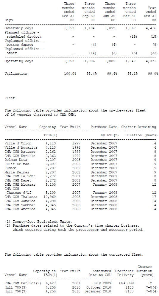 Comparative financial information for the three and nine months ended September 30, 2008 is prepared under predecessor accounting rules and includes the results of operations of two of the Company's vessels for part of January 2008 when they were owned by CMA CGM, a privately owned French container shipping company, and operated in CMA CGM's business of earning revenue from carrying containerized cargo. Global Ship Lease commenced its business of time chartering out vessels in December 2007 when it purchased 10 container vessels from CMA CGM. The Company purchased the two additional vessels from CMA CGM in January 2008 and has subsequently purchased an additional five vessels. The predecessor and Global Ship Lease business models are not comparable.